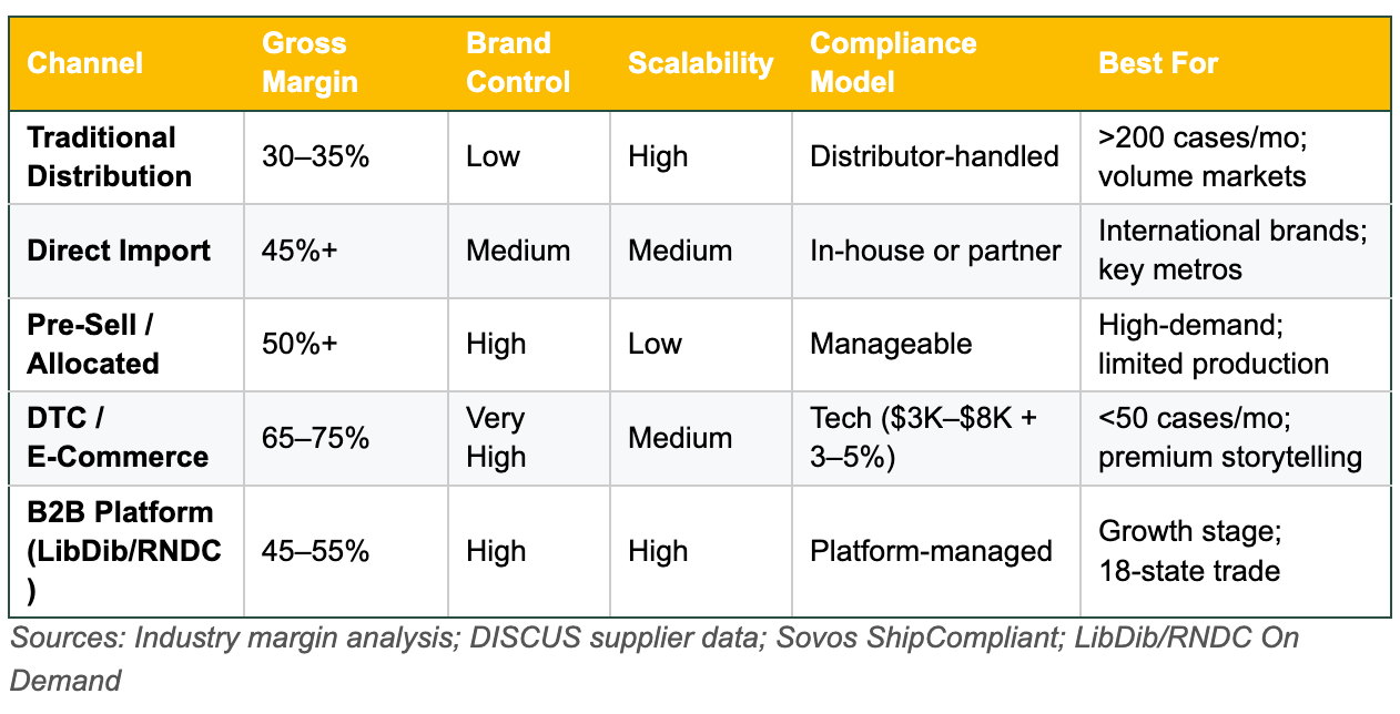 Audit distribution economics. Calculate value-to-cost ratio for every distributor relationship. Deploy compliance technology for at least one direct channel. If eligible for California’s AB 1246 ($125 application, $25–30 annual permit), file now. Same for New York reciprocal shipping. Register on LibDib for trade access across 18 states.