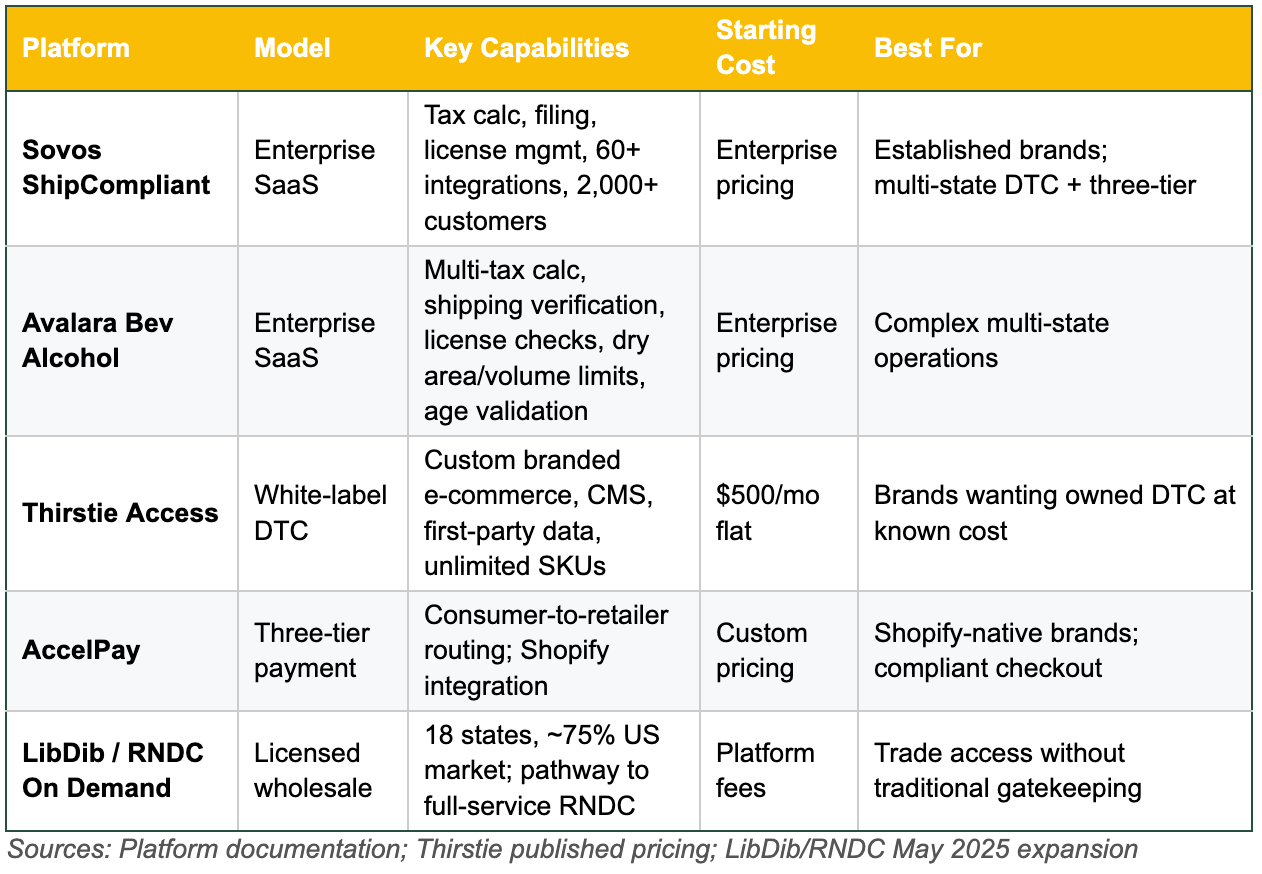 For a brand doing $500,000 in annual DTC revenue, the math is blunt: technology-enabled compliance costs $15,000–33,000 per year (or as low as $6,000 at Thirstie’s flat rate). The equivalent compliance function embedded in a traditional distributor’s 30–35% margin on that same revenue: $150,000–175,000. That’s $117,000–160,000 in annual margin recapture—capital that can fund product development, customer acquisition, or survival in a declining market.